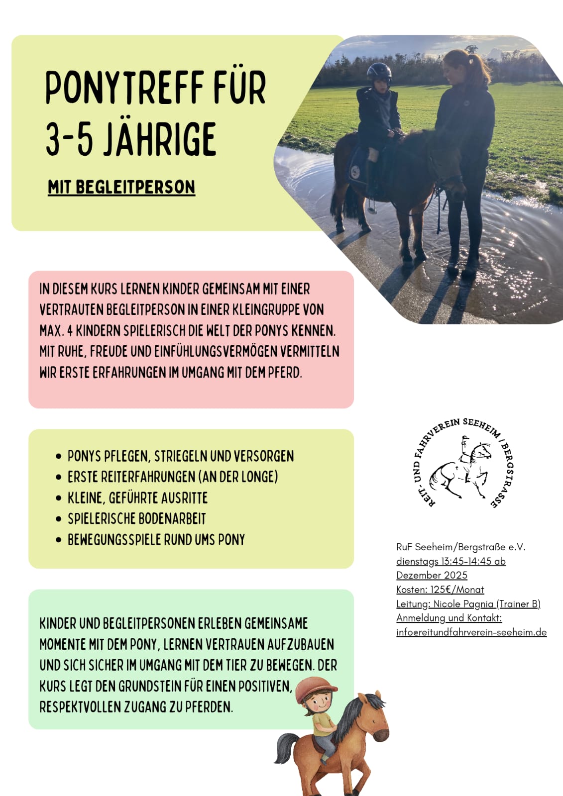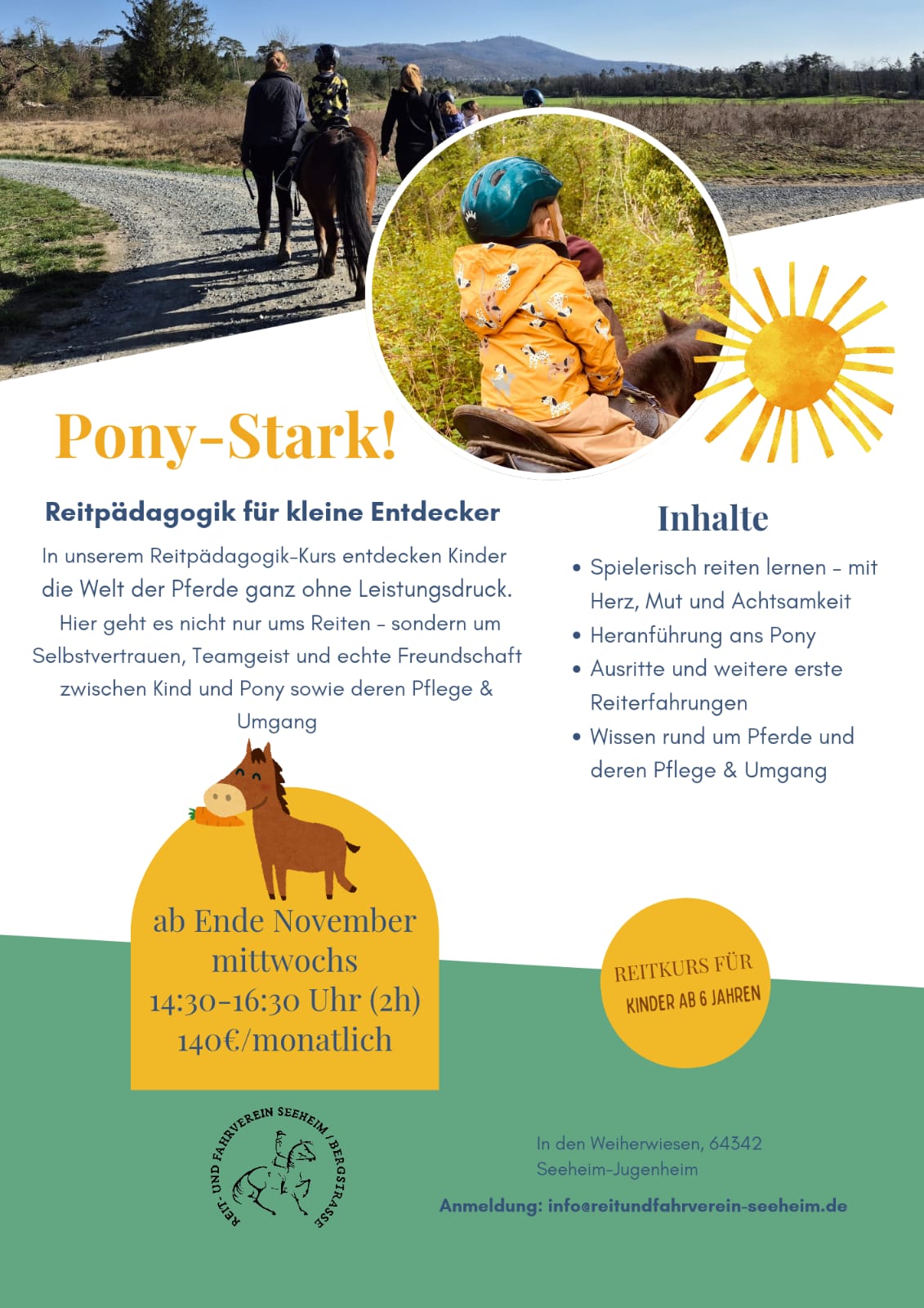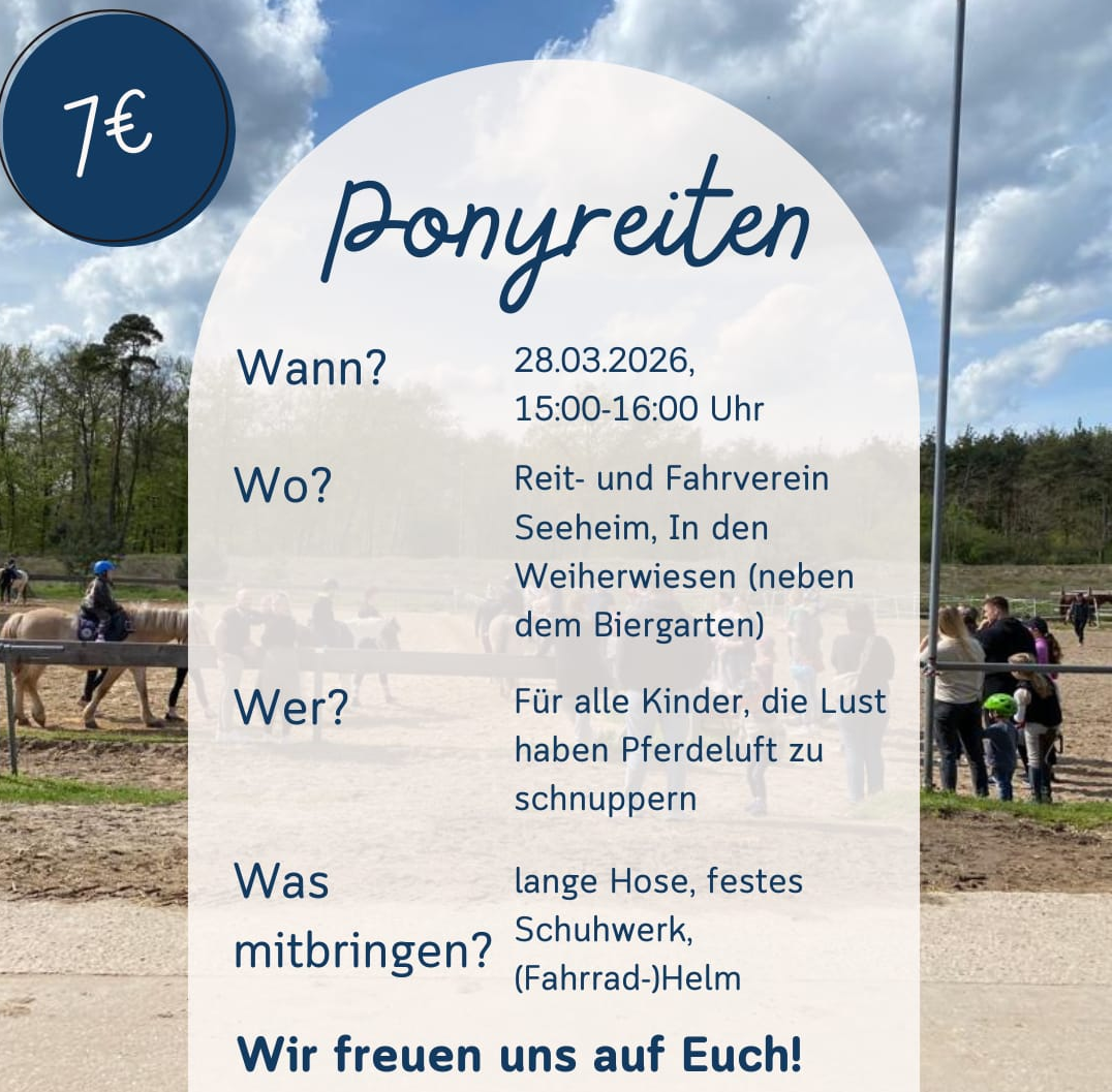 Am 05.07.2024 startet der Reitverein Seeheim seine neue Krabbelgruppe „Die Schnullipferdchen“. Teilnehmen können Babys und Kinder ab 6 Monaten bis 3 Jahre zusammen mit ihrer Bezugsperson. In zunächst 10 Terminen am Vormittags a 60 Minuten (240€) tauchen wir gemeinsam in die Welt der Pferde ein. Im Vordergrund stehen Basteln, Singen und das Erleben aller Sinne rund um die Thematik Pferd. Eltern und Kinder dürfen hier gemeinsam Spaß haben und sich in einer unterstützenden Umgebung austauschen. Bucht Eure Auszeit mit den Pferden jetzt unter nicole.pagnia@reitundfahrverein-seeheim.de (Termine auf Anfrage, freitags zwischen Juli bis November 10.00 Uhr)